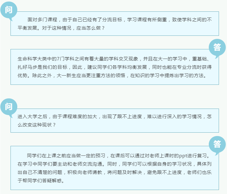 在本次师生交流会上,同学们积极提问,从多个方面如学业发展、课余活动、时间分配等各方面提出了咨询,下面列举的是其中两个主要问题的答疑。