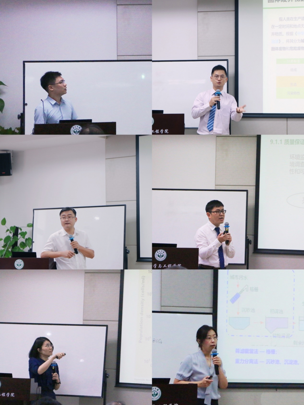 本次竞赛由“教学方案设计”和“课堂教学”两部分组成。曹建平老师、张欣然老师、彭星星老师、夏德华老师、王成老师、晁元卿老师6位副教授按照随机抽签结果分别进行了20分钟的课堂教学展示,依次讲授了“大气环境学”、“环境学导论”、“环境工程微生物学”、“环境监测”、“环境管理学”和“生态学”课程的相关节段。参赛教师们充分展现了积极备战的态度、认真专业的表现、全面扎实的基本功。