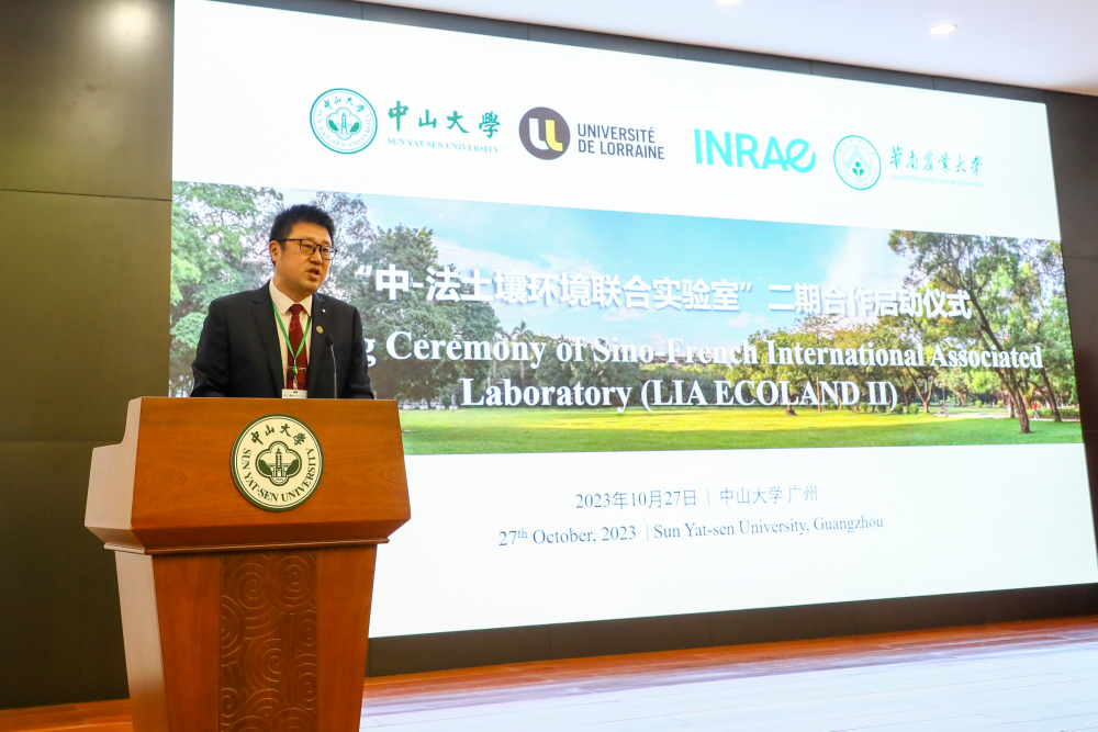华南农业大学副校长仇荣亮教授在致辞中讲道,作为联合实验室一期的中方主任,非常高兴见证了实验室一期建设的稳步推进和快速发发。联合实验室作为中法科技合作的楷模和成功案例之一,入选法国农业食品环境科学院过去20年12项最佳国际合作成果,同时为中法两国在土壤生态环境保护和全球气候变化应对方面的科技工作提供了有力支持。ECOLAND二期将推动中法在土壤环境科技领域更深入的合作,取得更大的合作成就。他表示,未来在华南农业大学、yl1111永利集团、法国洛林大学与法国农业食品环境研究院专家学者的共同努力和持续协作下,联合实验室将取得更多突破性研究成果,为解决全球土壤环境问题和社会经济发展面临的共性问题贡献更多的智慧和力量。