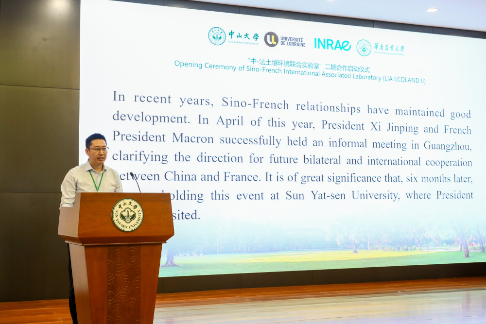 法国驻广州总领事馆科技与高等教育领事Olivier NGO先生随后致辞,对ECOLAND二期合作表示热烈祝贺。他指出,这一合作既是科学领域的合作,还是中法友好关系的象征,法国驻华大使馆以及法国驻广州总领事馆会鼎力支持,为项目开展保驾护航。