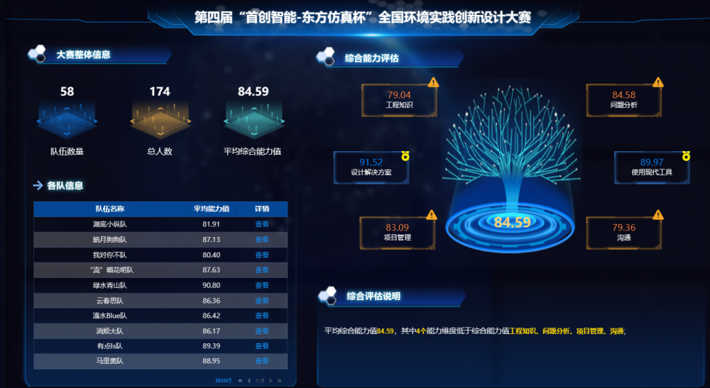 大赛行稳致远,经历时间考验,不断攀登高峰。闭幕式上,大赛裁判长黄雄飞老师采用大数据分析系统分析了决赛总体情况:84.17%的参赛选手充分呈现了自主探究能力,结合课程和实际工程知识,深入解读和研究流域综合治理、污水管网设计两个虚拟仿真设计项目;84.61%的选手基本掌握相关的知识点,体现当代大学生积极进取、主动科学探索;大赛参赛选手平均综合能力值达到了84.59,体现了较高的综合能力素质。