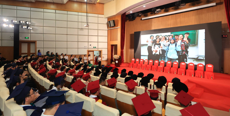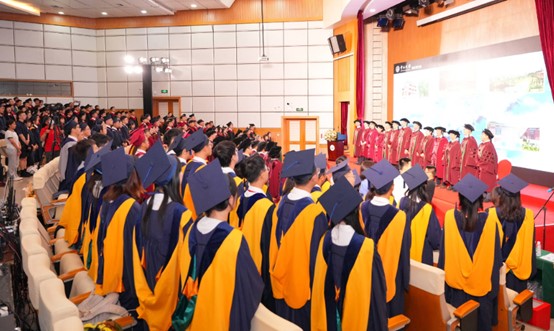 在毕业生和观礼亲友的热烈掌声中,主礼教授及导师入场就坐。在场师生亲友共同观看了包含了过去几年毕业班同学们学习生活剪影的毕业视频,以及老师们对毕业生的寄语,观看现场充满着欢声笑语和感动。