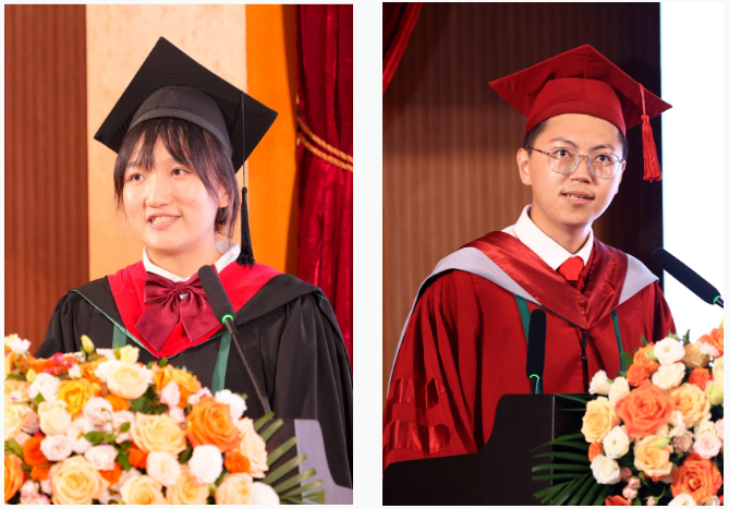 接着由本科生毕业生代表陈锦娟同学和研究生毕业生代表郑鸿祥同学分别上台发言。两位同学通过分享了过去的成长经历、收获和感想,代表全体毕业生感谢学院提供的资源和环境,以及老师们的辛勤付出和无私奉献,相信有了学院给予的信念与力量,毕业生们将做好准备迎接新挑战,携手向前,挺膺担当,奔赴光荣与梦想的远征。