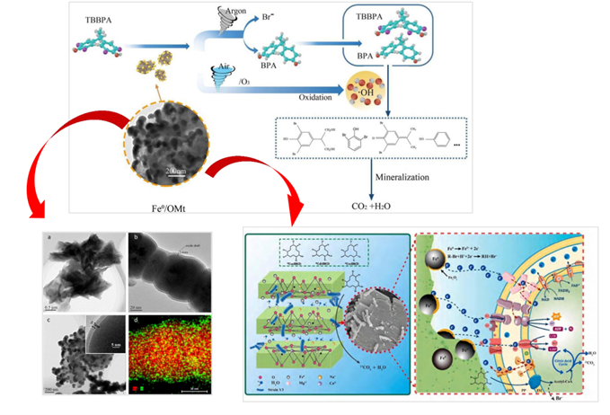 1)改性零价铁的化学还原作用:以蒙脱土为载体负载纳米零价铁(ZVI),并通过Fe-Ni双金属、硫化改性等方式优化零价铁性能,解决传统零价铁易钝化的问题;改性零价铁通过电子传递实现对溴代阻燃剂等难降解新污染物的还原脱卤、断键,将大分子有毒污染物分解为小分子易降解中间体,同时对重金属离子进行还原沉淀、吸附固定,实现重金属的高效去除;